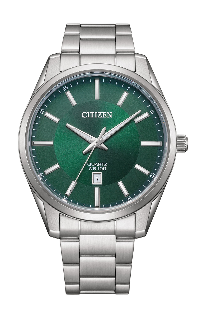 A striking green sunburst dial catches the light beautifully, set within a stainless steel case and bracelet that offers both durability and refined style. The fold-over clasp with push button ensures a secure and comfortable fit, while 100-meter water resistance makes it suitable for daily wear. With precise quartz movement and a date display at 6 o’clock, this timepiece delivers reliability and timeless elegance in equal measure.