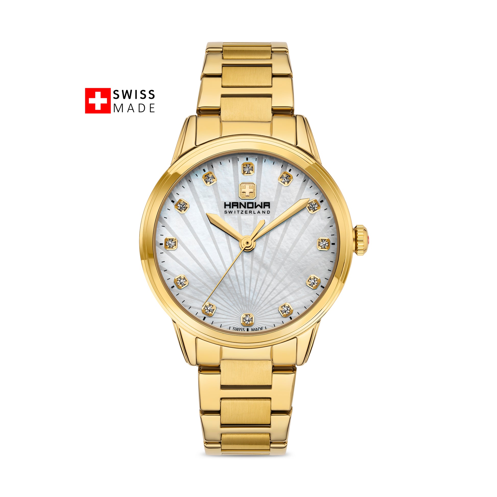 HANOWA wristwatches combine elegance with precision. The Canova model, designed for women, features a yellow gold-plated stainless steel case with a white mother of pearl dial, offering a classic and sophisticated timepiece.
