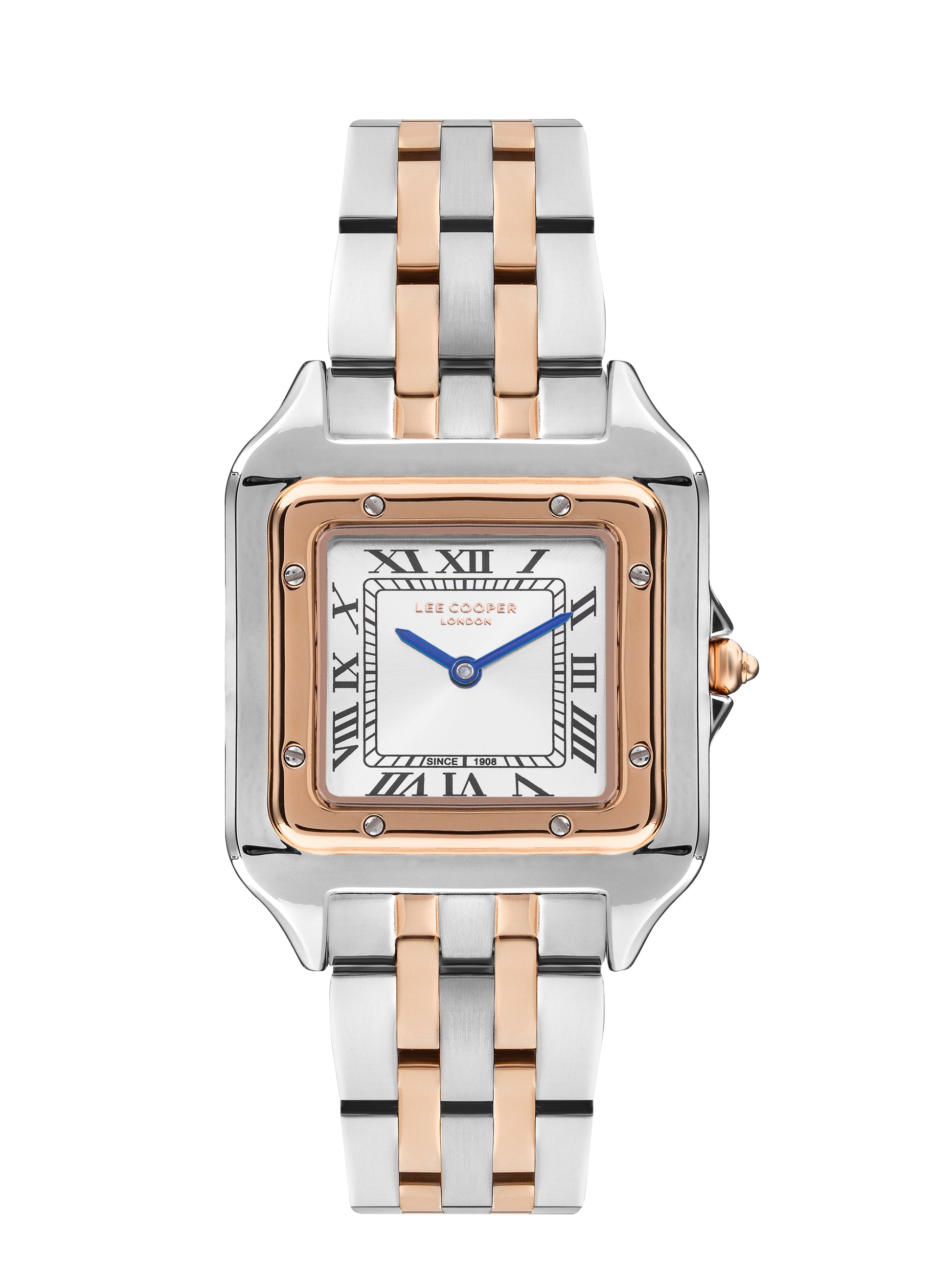 The Lee Cooper LC07866.530 Women's Analog Watch combines elegance with reliable performance. Featuring a 29mm square silver dial, it is powered by a quartz movement. The silver and rose gold metal band with clasp closure offers both style and secure wear. The watch is water-resistant up to 3 ATM, making it suitable for everyday use. It comes with a warranty card and a 2-year warranty.